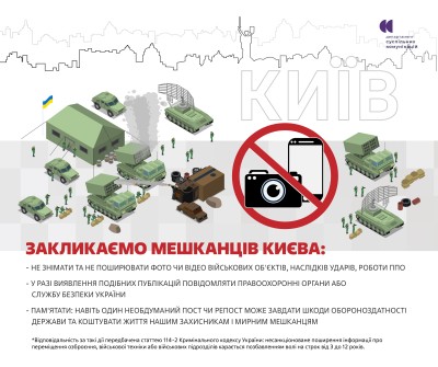 Нагадуємо мешканцям столиці та представникам медіа про категоричну заборону фото- та відеозйомки військових об'єктів, систем протиповітряної оборони, місць уражень та будь-якого переміщення чи розташування Збройних Сил України та інших військових формувань.