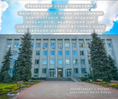 Зміна адреси місця проведення консультацій щодо переліку документів, необхідних для державної реєстрації речових прав на нерухоме майно та їх обтяжень Департаментом з питань реєстрації виконавчого органу Київської міської ради (Київської міської державної адміністрації).
