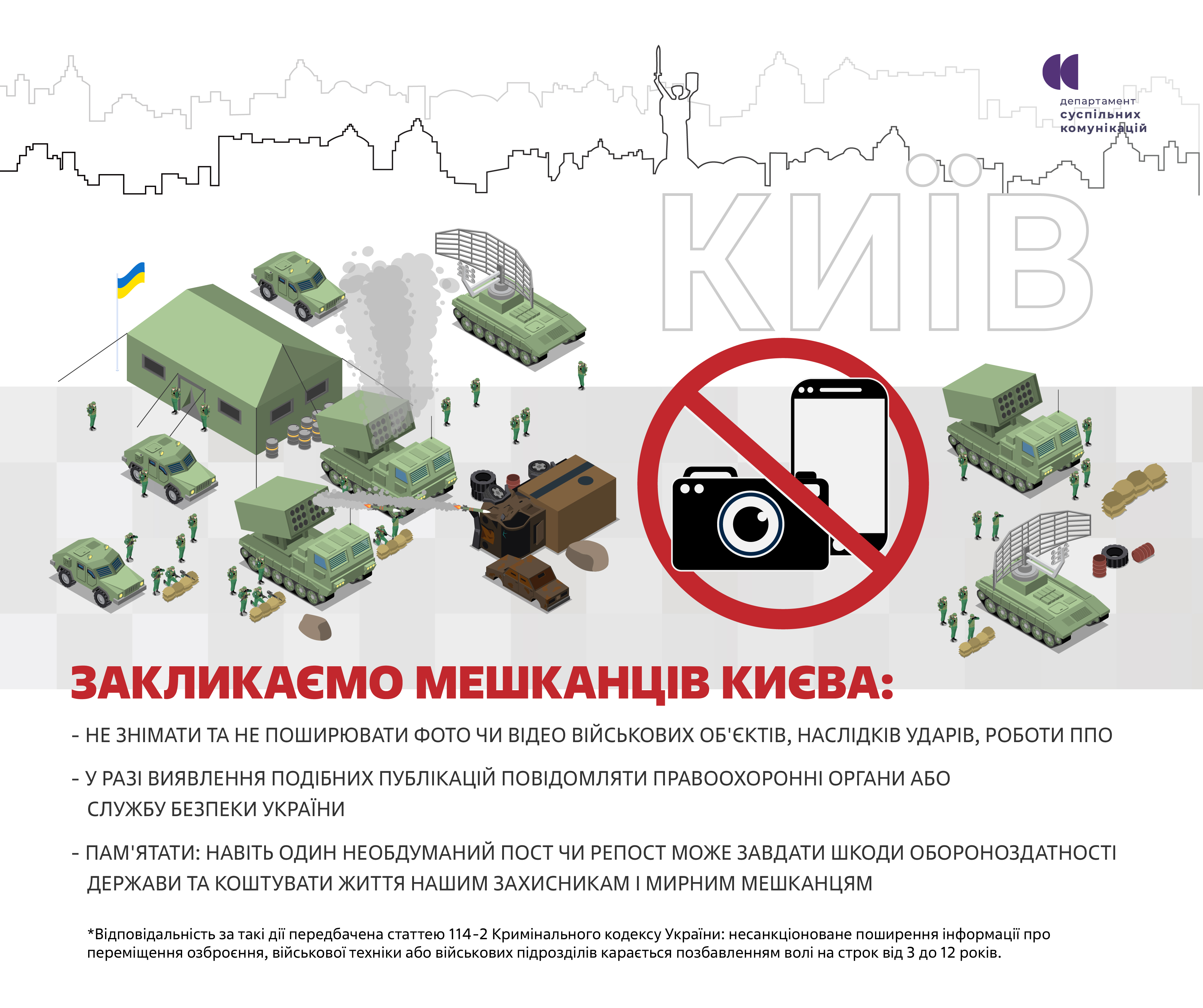 Закликаємо киян не поширювати фото- та відеозйомку військових об'єктів, систем ППО, місць уражень та будь-якого переміщення чи розташування ЗСУ та інших військових формувань