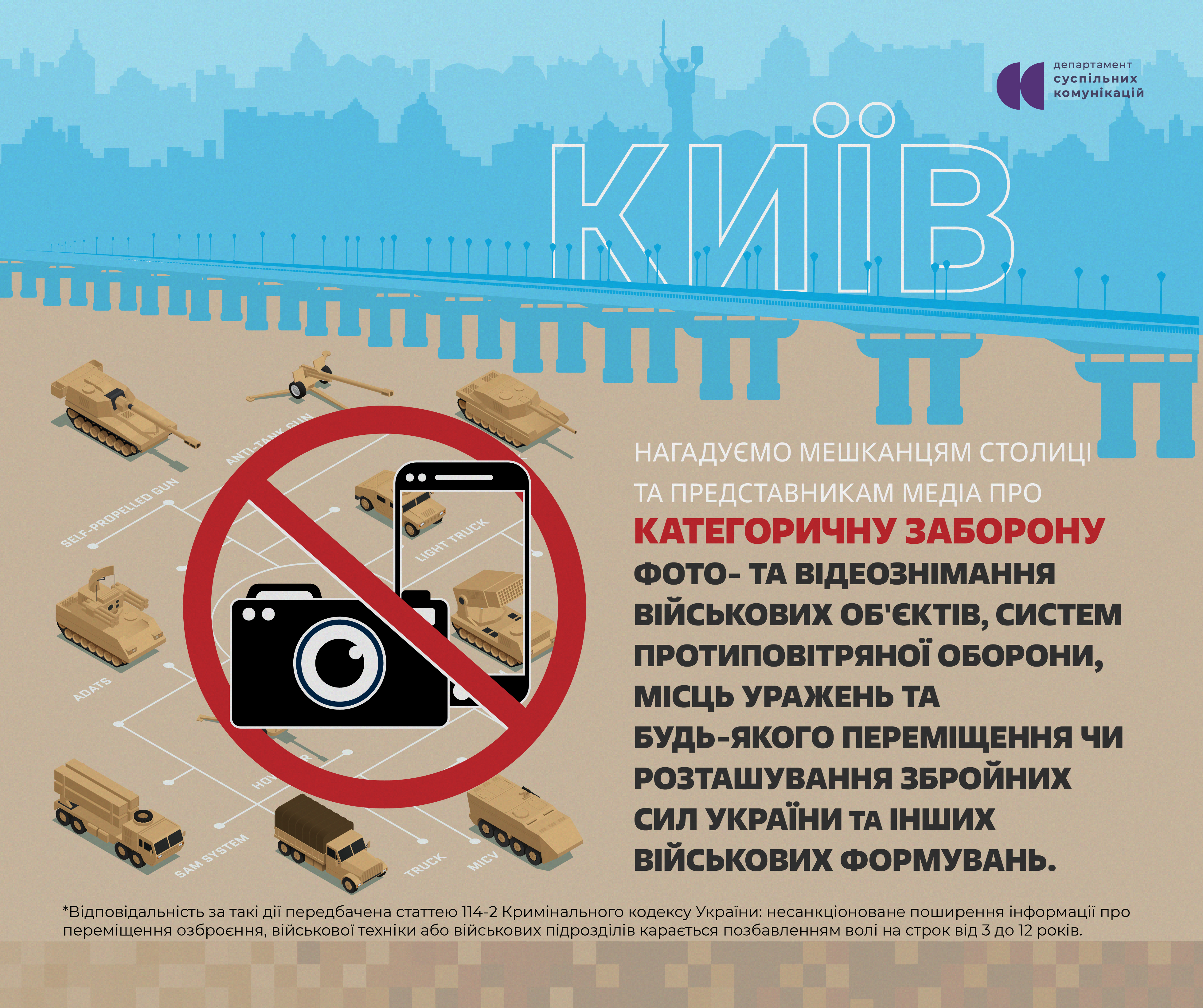 Нагадуємо мешканцям столиці та представникам медіа про категоричну заборону фото- та відеозйомки військових об'єктів, систем протиповітряної оборони, місць уражень та будь-якого переміщення чи розташування Збройних Сил України та інших військових формувань.